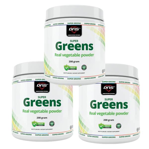 Super Greens er 100% naturlig grønnsakspulver uten tilsetningsstoffer. 3-pack Super Greens til kun 599,- Spar Penger!Er du på jakt etter en praktisk og deilig måte å øke ditt daglige inntak av sunne vitaminer og mineraler? Da er DNS Super Greens Pulver noe for deg! Pakket med en kraftig blanding av Brokkolipulver, Spinatpulver, Avokado ekstrakt, Spirulina pulver, Hvetegress…
