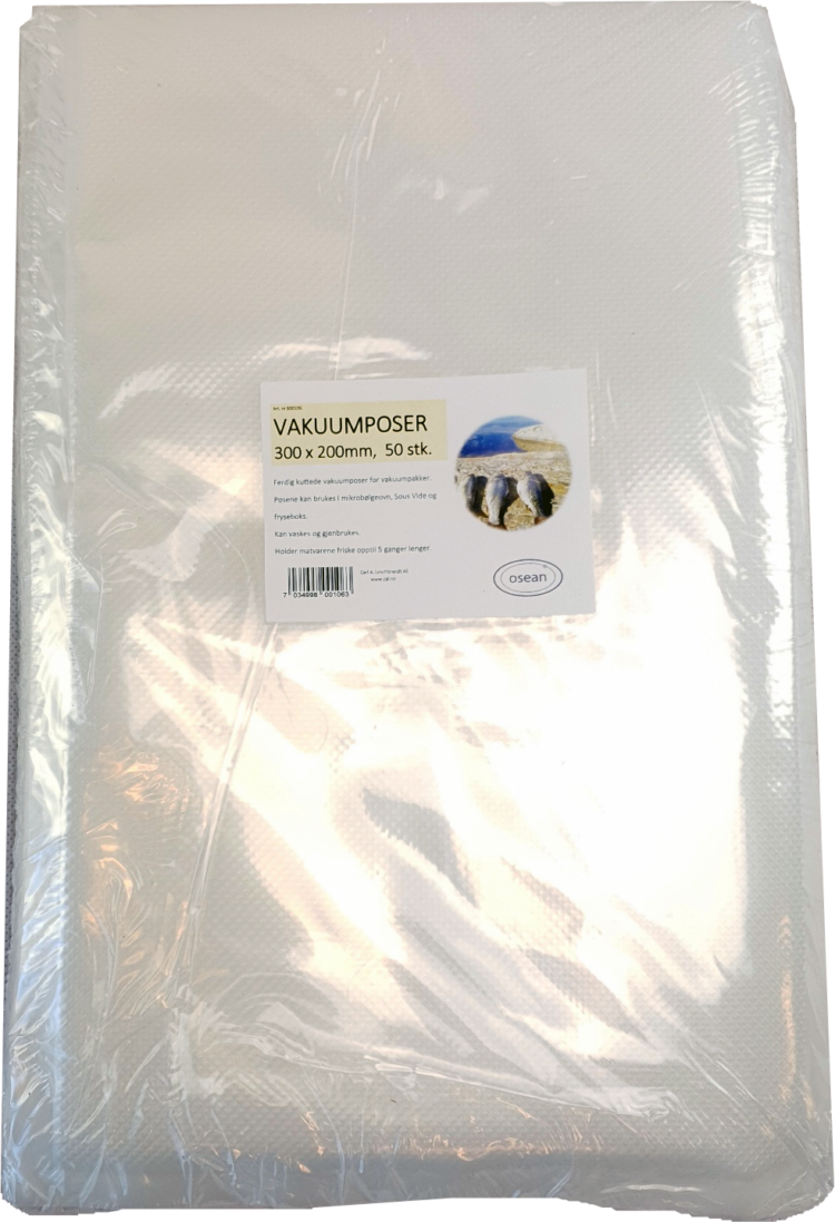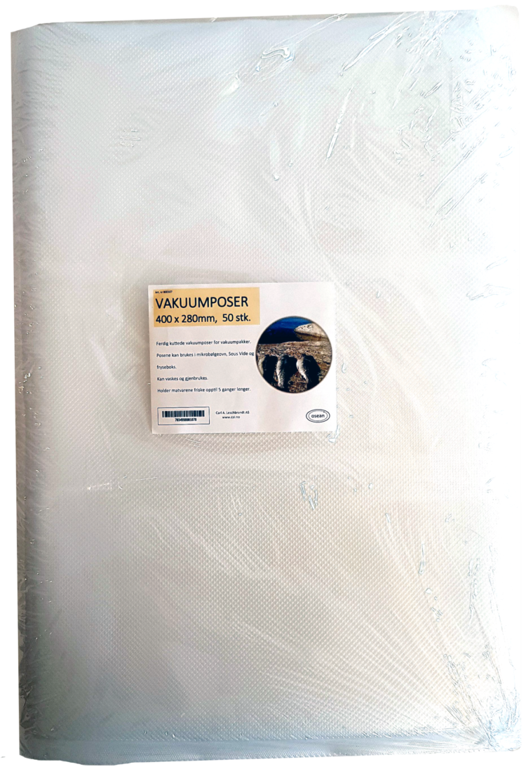 Vakuumpose som passer de fleste vakuumpakkere på markedet. Dim: 400 x 280mmTykkelse ca 90µm Store, ferdigkuttede poser som passer fint til vakuumering av vilt, laks og større kjøttstykker. Også fint for vakuumering av klær for reise etc. Posene kan brukes i mikrobølgeovn, Sous Vide og de kan vaskes og gjenbrukes.Posene har en glatt og en ruglete…
