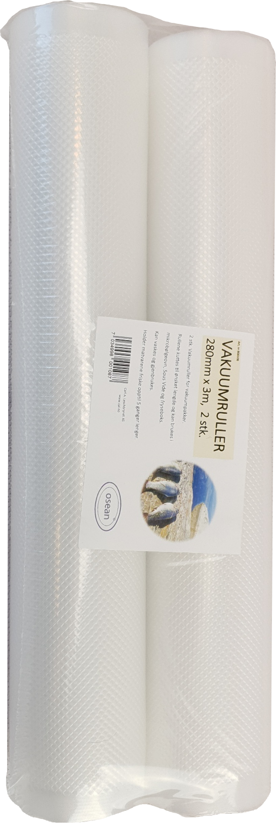 Vakuumrull som passer de fleste vakuumpakkere på markedet. Dim: 3m x280mmTykkelse ca 90µm Rull på 3m lengde og 28cm bredde. Rullen kan oppbevares i vakuumpakkeren (800105), hvor du enkelt benytter den innebygde kutteren til å kutte av ønsket lengde. Deretter bruker du vakuumpakkeren til å forsegle enden. Veldig bra egnet til å forsegle hel laks, rådyrlår etc….