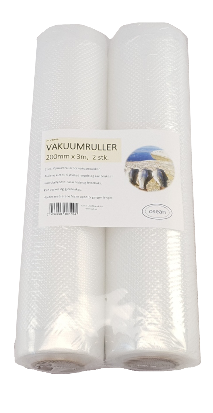 Vakuumrull som passer de fleste vakuumpakkere på markedet. Dim: 3m x200mmTykkelse ca 90µm Rull på 3m lengde og 20cm bredde. Rullen kan oppbevares i vakuumpakkeren (800105), hvor du enkelt benytter den innebygde kutteren til å kutte av ønsket lengde. Deretter bruker du vakuumpakkeren til å forsegle enden. Veldig bra egnet til å forsegle hel laks, rådyrlår etc….