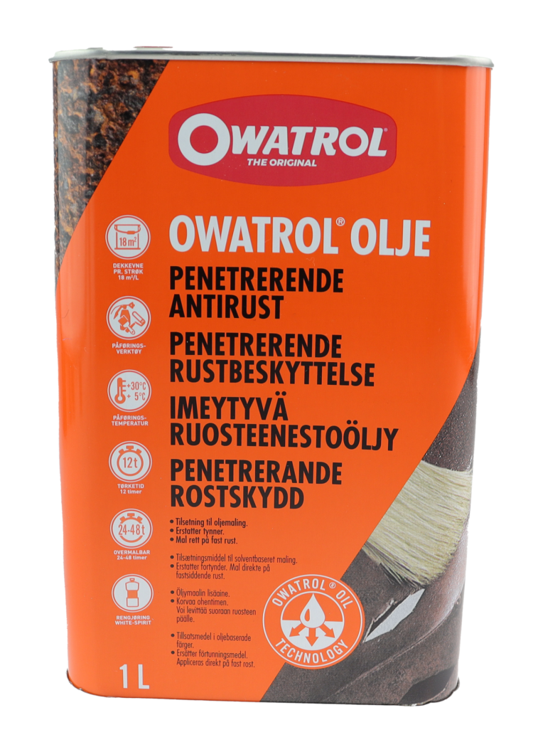 OWATROL OLJE Malingstilsetning/grunning /rustbeskyttelseEn unik malingstilsetning som forenkler påføring av maling under vanskelige værforhold.Blandet i oljebasert maling/lakk vil Owatrol Olje forbedre finishen ved å redusere/fjernepenselstriper og øke åpningstiden. I motsetning til andre tynnere vil Owatrol Olje bedreelastisitet og sørge for lang holdbarhet uten fare for avflassing. Rustbeskyttelse Kjent for sin evne til å penetrere inn i de minste…