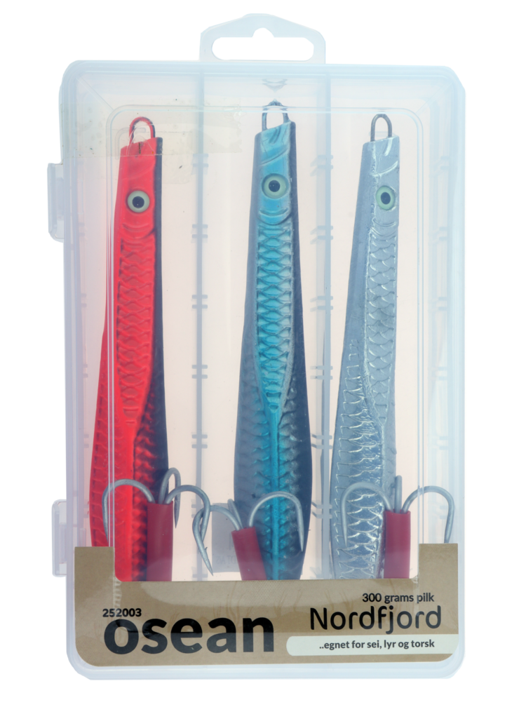Osean Nordfjordpilken – allsidig pilk for fiske etter de fleste typer bunnfisk som sei, lyr og torsk. Sett med 3 stk pilk i fargene Sølv/Blank, Blå/Sølv og Svart/Rød. Finnes i 3 vektklasser, og leveres med treblekrok m/rød slange.100gr/krok 4/0 200gr/krok 5/0 300gr/krok 7/0 Pilkene er blyfrie og leveres i praktisk oppbevaringsboks som også kan henges på pigg Nyhet – leveres…