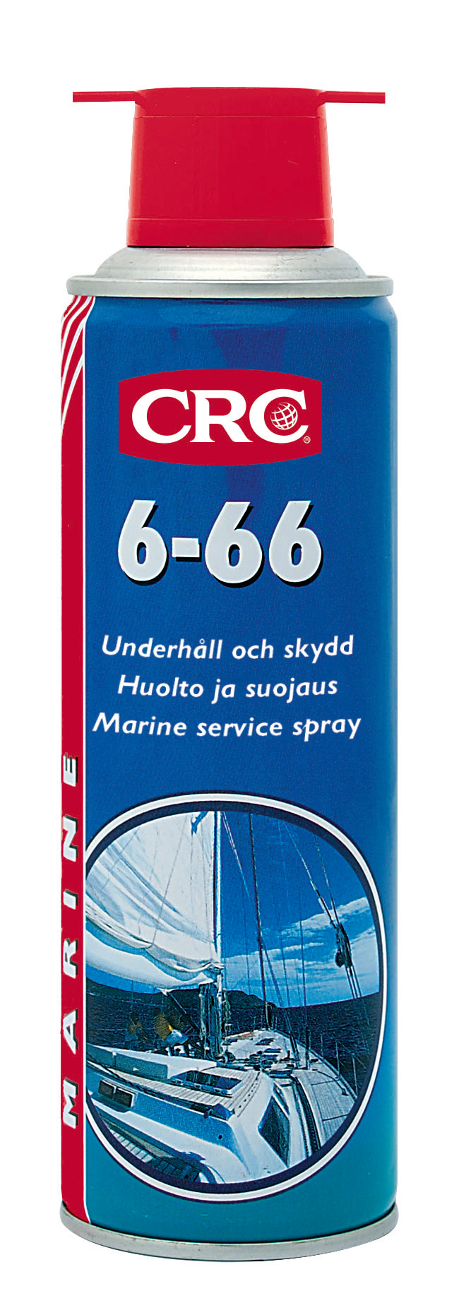 CRC 6-66 Marine   Et universalmiddel for beskyttelse av metaller og malte flater som er utsatt for vann, fukt og saltholdig luft, eksempelvis ombord i båter. Danner en tynn, klar, usynlig film som fortrenger vann og fukt, smører, rengjør og beskytter mot korrosjon. Til bruk i alle slags båter, f.eks. for å starte og beskytte våte innen-…