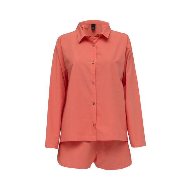 Sirius Orange Pysjamas Høie Late sommerdager hvor man bare tusler rundt i pyjamasen er de beste.Sirius pyjamas er laget i en deilig percale kvalitet av 100% bomull, som er “prewashed”, for optimal mykhet og komfort.Pysjamasen har en komfortabel passform, og kommer som skjorte og shorts. Modellen er 178 cm og bruker str S Produktinformasjon:100% bomullPrewashed percaleOeko-Tex Made in GreenLøs…