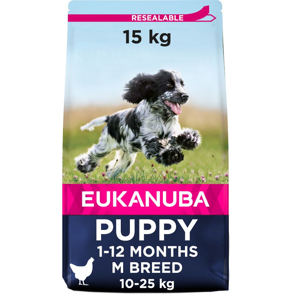 Eukanuba Puppy middelsstore raser er et balansert, fullverdig fôr, utviklet for de spesielle næringsbehovene hos oppvoksende middelsstore hunder(raser som collie, cocker spaniel, dachs eller beagle). Kylling som hovedingrediens gir den oppvoksende valpen et naturlig næringselement som inneholder førsteklasses proteiner og sørger for dannelsen av kraftig, mager muskulatur. Kalsium er gunstig for benbyggingen, mens andelen av Dokosaheksaensyre (DHA) fremmer læreevnen og intelligensen. I tillegg styrker antioksidanter det naturlige immunforsvaret i utviklingsfasen. Et 100 % komplett og balansert fôr, utviklet i samarbeid med veterinærer for å hjelpe valpen i utviklingen og kunne erobre verden. Fôret inneholder et optimalt avstemt forhold av proteiner, fett, karbohydrater, fiber, vitaminer og mineraler. For at valpen skal kunne ta til seg alle næringsstofene, bør den ha en balansert tarmflora. Prebiotika og sukkerroefiber gir en balansert tarmflora og en harmonisk fordøyelse. I 10 år har Eukanuba holdt øye med hunders levealder, og funnet at de kan nå en høyere alder enn gjennomsnittet! Din trofaste firbeinte fortjener å nyte et lengre liv enn gjennomsnittet. Den 10 årige undersøkelsen fra Eukanuba viser at fôret fra Eukanuba kan hjelpe hunden å leve et lengre liv. Ved å benytte det utenomvanlige fôret, koblet med artsriktig pleie, kan du og din trofaste venn få et lengre liv sammen. Spesifikke Produktegenskaper: Tørrfôr for valper av mellomstore raser fra 1 – 24 måneder med en voksen målvekt på 11- 25 kg 100% komplett og balansert – utviklet i samarbeid med veterinærer Sterk og mager muskulatur Kylling gir førsteklasses og lettfordøyelige proteiner Styrket immunforsvar gjennom verdifulle Probiotika/FOS og essensielle antioksidanter (Vitamin A, C, E og Carotinoide) og redusering av for tidlig cellealdring Sunn hud og blank pels fremmes gjennom essensielle Omega-3 og Omega-6-fettsyrer og vitaminer og Mineraler Sterk, fettfattig muskulatur gjennom regelmessig trim og fôr med høyverdige proteiner. L-Carnitin øker fettforbrenningen Lettfordøyelige proteiner og sukkerroefibre fremmer næringsopptaket og gir en optimal fordøyelse Verdifullt kalsium og en balansert energi- og næringsforsyning understøtter oppbyggelsen av sterkt skjelett og sunne ledd Dokosaheksaensyre (DHA) en essensiell Omega-3-Fettsyre, som styrker utviklingen av hjerne og nervevev, og øker valpens læringskurve Uten farge-, aroma- og konserveringsstoffer