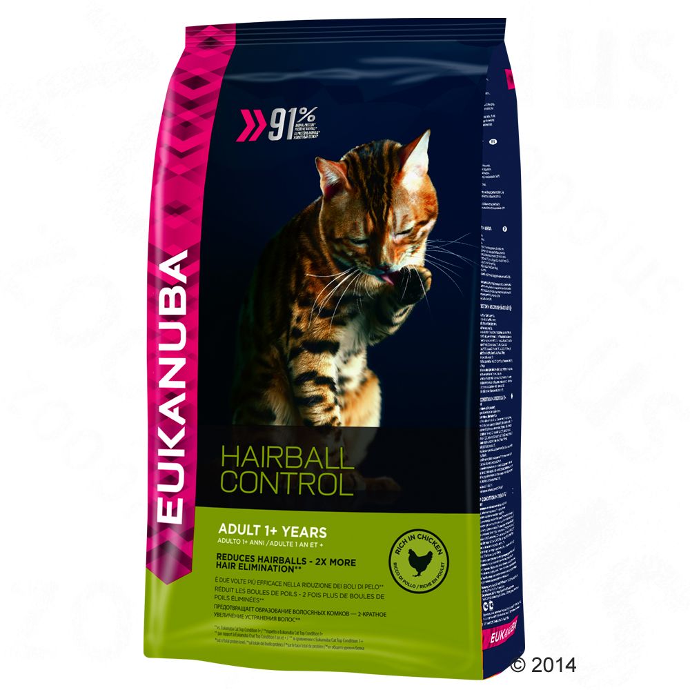 Eukanuba Hairball Control Adult er et perfekt avstemt, inntil 100% komplett kattefôr, ideèlt for innendørskatter fra 1 år. Nettopp ved pelsveksling har innekatter en tendens til å utvikle pelsballer, da de svelgede hårene ikke glir gjennom fordøyelsessystemet. Dette fôret ble utviklet sammen med veterinærer, og er takket være en spesiell blanding av naturlige fibre istand til å binde svelgede hår og føre dem mykt og sikkert gjennom fordøyelsessystemet. 91% animalske proteiner fra kylling og kalkun av totalproteinet, dette utnyttes optimalt av katter og styrker i tillegg oppbyggelsen og vedlikeholdet av en slank muskulatur. Vitaliteten og derved velværet hos katten din støttes av vitamin E -tilsetningen som er full av antioksidanter. Disse hjelper ved styrking av immunsystemet og det naturlige forsvaret i kroppen. Også en harmonisk fordøyelse er viktig for kattens velvære, og spesielle probiotika som FOS og fiber er tilsatt for fordøyelsen. I tillegg fremmer de spesielle betefibrene et effektivt næringsopptak. Et lavere magnesiuminnhold kan dessuten hjelpe å opprettholde et sunt urinveissystem. Takket være et optimalt forhold av Omega- 6- og -3-fettsyrer forbedres også hud- og pelskvaliteten, noe som også gir katten en vakker pels. Leverandelen sørger ikke kun for beste smak, men vil med mineral- og kalsiuminnholdet sørge for sterk benbygning. De spesielle krokettene fremmer avsliping av tannlelegg ved tygging og kan derfor hemme oppbygging av tannstein. Produktet inneholder ikke kunstige tilsetninger som konserverings-, aroma eller fargestoffer. Eukanuba Hairball Control Adult overbeviser: Fullfôr til voksne katter over 1 år Ideèllt fôr til innendørs katter med tendens til pelsballproblemer Pelsballkontroll: spesiell blanding av naturlige fibre som på en naturlig måte binder svelgede hår og mykt fører dem ut endetarmen, motvirker hårballdannelse 91% animalsk protein: av totalprotein, for en optimal utnyttelse, for oppbygging og vedlikehold av en slank muskulatur 45% kjøttandel: kylling av beste kvalitet som hovedingrediens Vitalitet: styrking av immunsystemet og de naturlige forsvarsmekanismene med verdifulle antioksidanter av vitamin E Urinveiene: et lavt innhold av magnesium beholder sunnheten i urinveiene Hudt & pels: et optimalt forhold av Omega-3- og Omega-6-Fettsyrer, for en suhh hud og blank pels Tannhelse: spesielle korketter fremmer ved tygging avsliping av tannbelegg, prophylaxe mot tannstein Rik på lever: sørger for beste smak og leverer mineraler og kalsium for sterk benbygning Utviklet i samarbeid med veterinærer Uten kunstige tilsetninger som konserverings-, aroma- eller fargestoffer