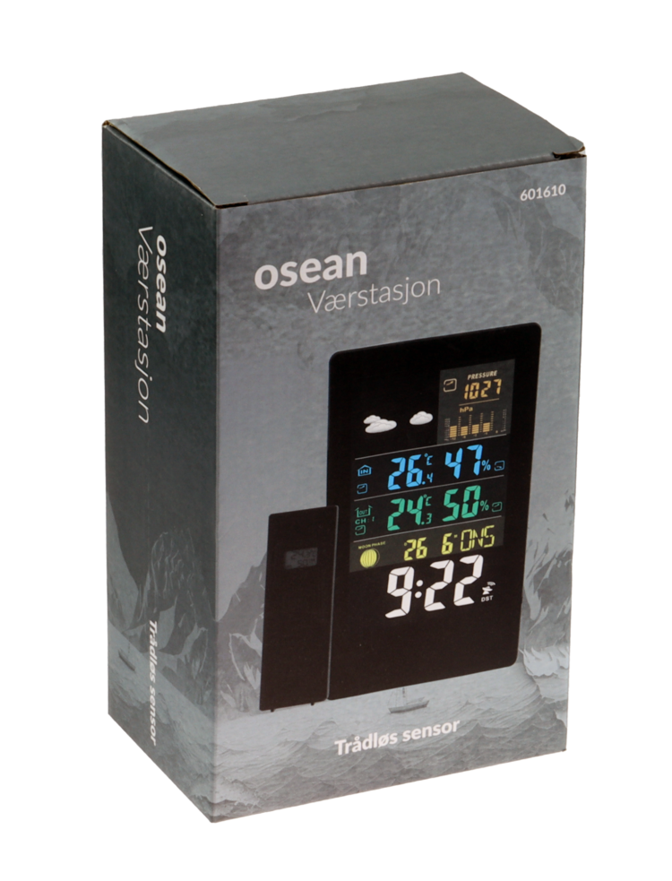 Osean værstasjon med flott design og tydelig fargeskjerm. Værstasjonen har barometer med 12t historikk, værprognose, innen- og utendørs temperatur, visning av månefase, kalender, radiostyrt klokke m/alarm og visning av luftfuktighet både innendørs og utendørs. Trådløs utendørssensor med display for temperatur og luftfuktighet.Hovedenheten drives av 5v AC adapter (inkludert) og 3xAAA batterier som backup.Utendørssensoren drives av 2 x AA batterier. Batterier ikke inkludert. Dim: Hovedenhet 105x50x176mmSensor: 38x24x108mm